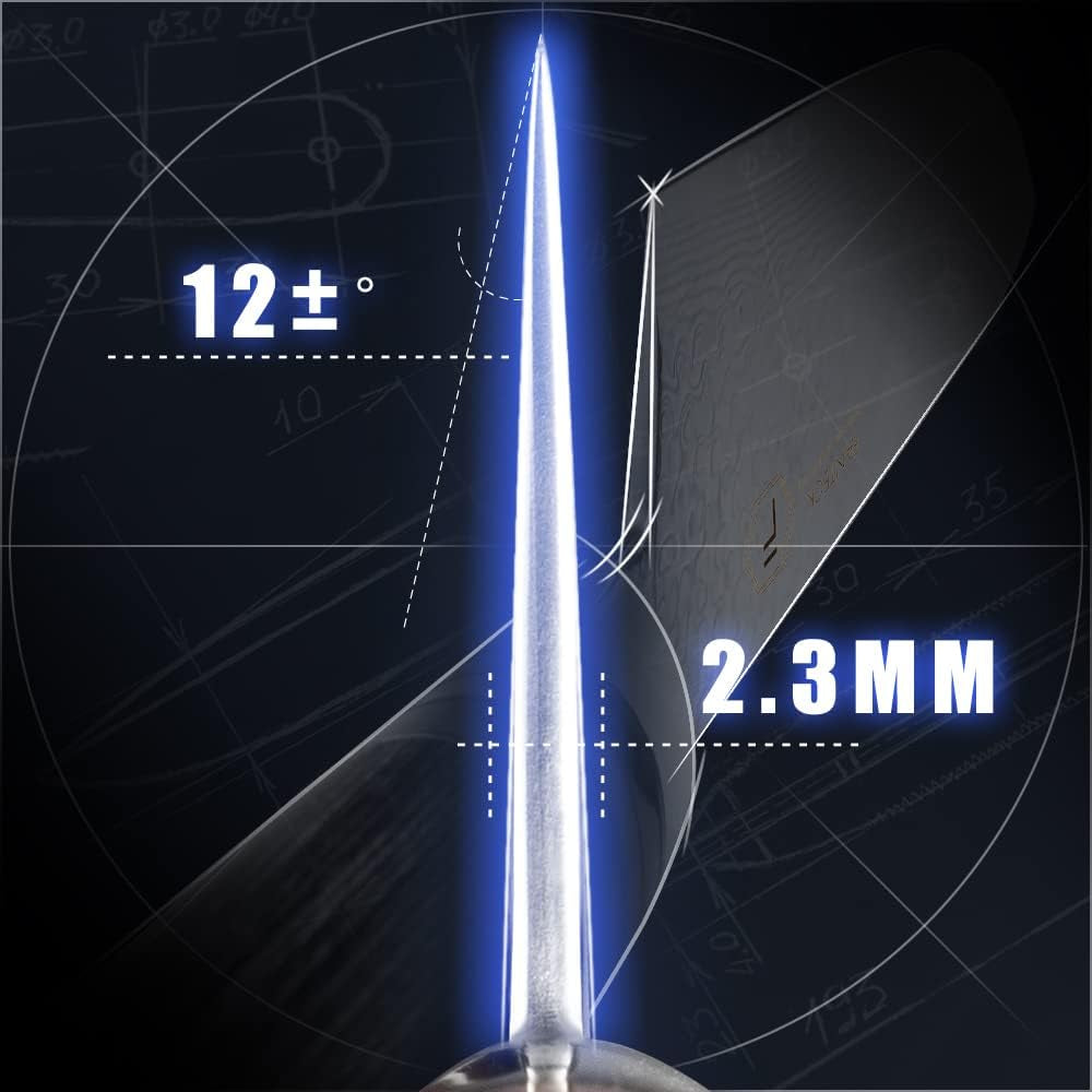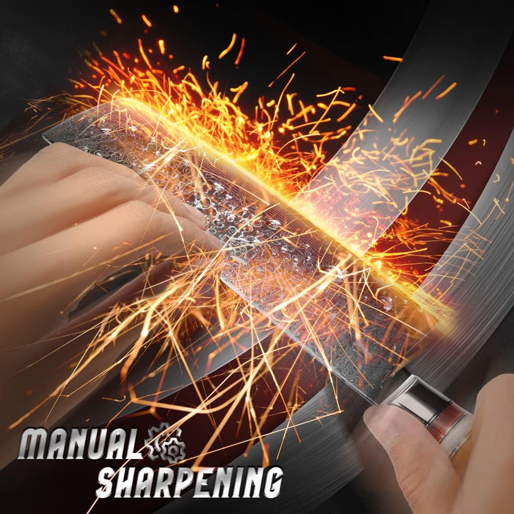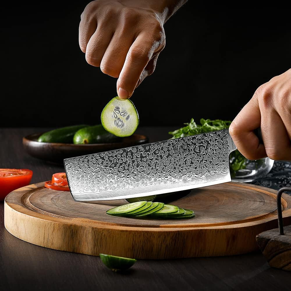 Expertly crafted with a high-quality V-shaped design for exceptional strength. durability. and stain resistance. Made with VG-10 Japanese Damascus steel material. featuring a 67-layer high carbon cutting core that boasts a 60+ Rockwell hardness. Each knife is precisely hand-sharpened to a 10-15�� angle per side. ensuring effortless slicing. This versatile 7-inch nakiri knife measures 11.8?inch in total length. with a blade length of 7.1 inch and a handle length of 4.7 inch. With a width of 2 inch and a thickness of 0.09 inch. it has a HRC of 60+ and a lightweight net weight of 0.53 lb. Presented in a beautiful gift box.