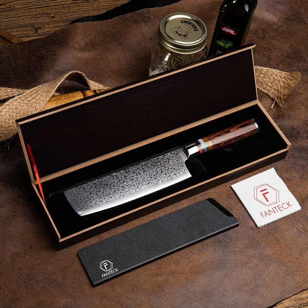 Expertly crafted with VG10 67-layer Damascus steel. the KD 7 Nakiri knife from FANTECK is a professional-grade kitchen essential. Its ergonomic Pakka wood handle offers precision and comfort for precise vegetable and meat cutting. Packaged in a sleek gift box. this knife is perfect for any aspiring chef.