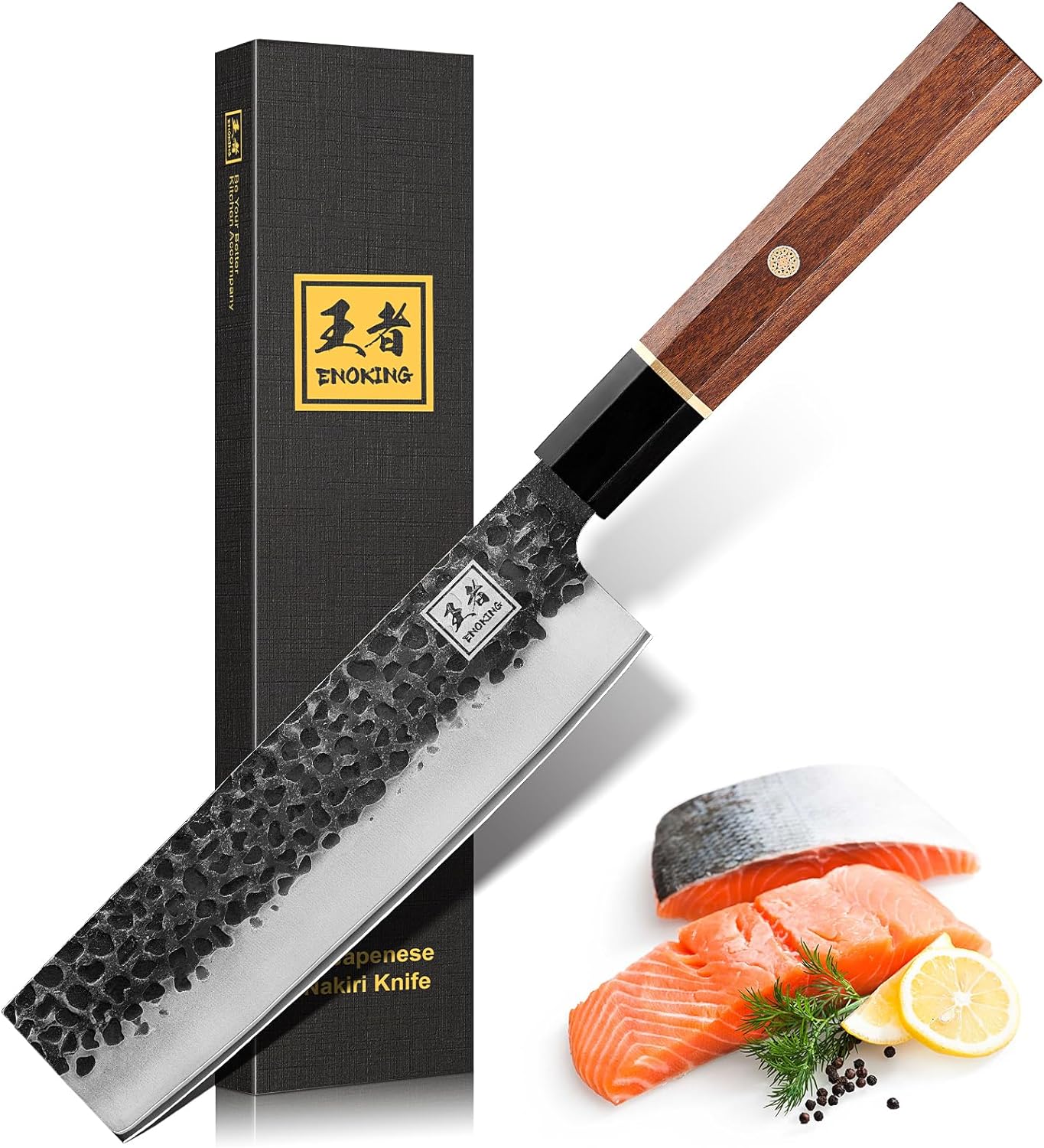 The KD Japanese Nakiri Chef Knife is a top choice for chefs who demand precision and quality. This 7-inch knife features a hand-forged 5 layer construction. with a durable 9CR18MOV clad steel blade and a beautiful rosewood handle. Perfect for chopping vegetables with ease and style. Comes with a gift box for added convenience.